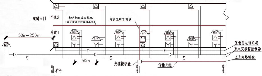 分布式光纖線型感溫火災(zāi)探測器(或光纖光柵線型感溫火災(zāi)探測器)應(yīng)設(shè)置在車道頂部距頂棚100mm~200mm,光纖光柵線型感溫火災(zāi)探測器的光柵間距不應(yīng)大于10m;每根分布式光纖線型感溫火災(zāi)探測器和光纖光柵線型感溫火災(zāi)探測器保護(hù)車道的數(shù)量不應(yīng)超過2 條;探測范圍要求整個(gè)隧道全部覆蓋無探測盲區(qū)。